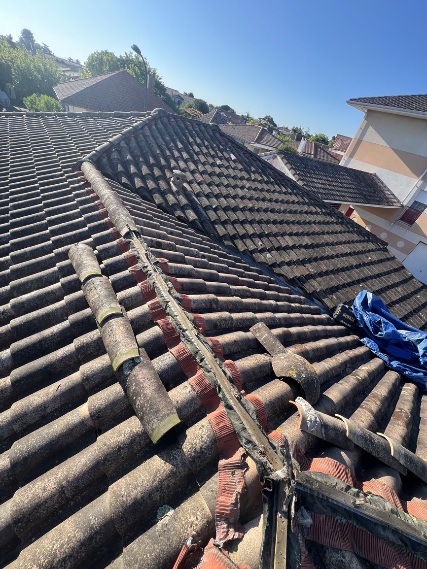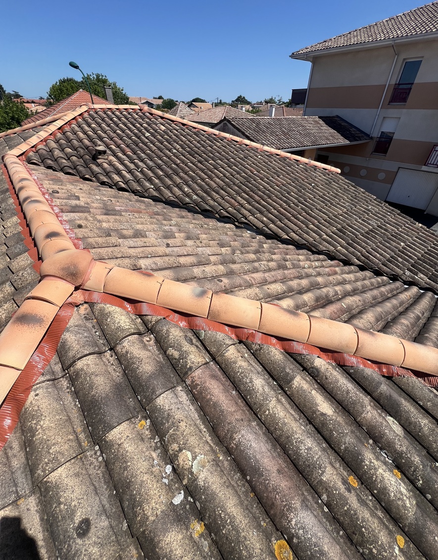 Dépose des anciennes tuiles faîtière et dépose des closoir endommagé mise en place des nouveaux closoir souple et ventilé pose de nouvelles tuiles faîtière avec Clips de fixation.